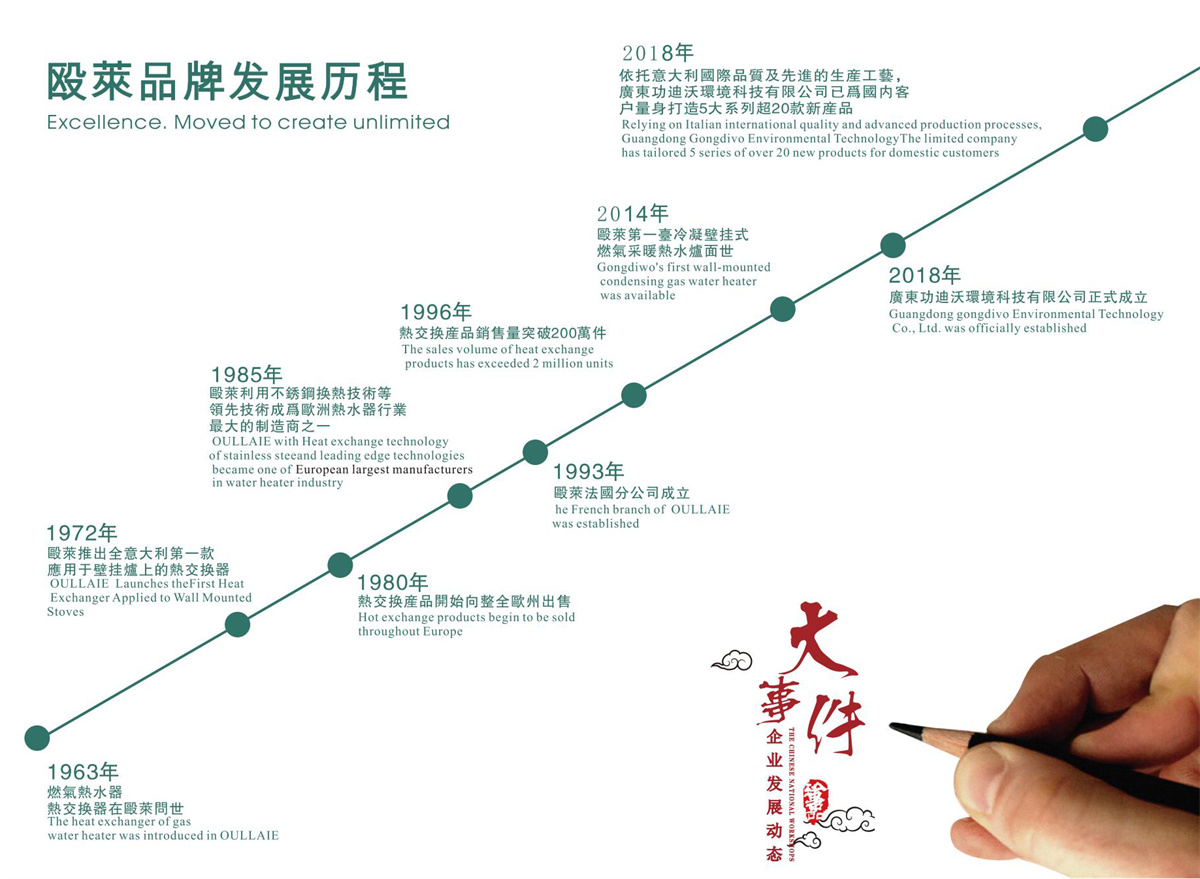 1998年意大利殴莱股份有限公司进入中国,成立了殴莱 (中国)品牌运营中心,开展在中国的营销、服务、采购、生産和研发等业务,向广大中国消费者提供全系列燃气采暖热水炉 、燃气热水器、燃气灶具、太阳能热水器等相关设备。